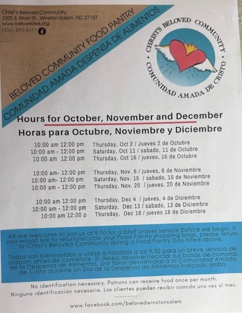 The Beloved Community Food Pantry/Comunidad Amada Despensa de Alimentos, is a bilingual food pantry for the residents of Southside Winston-Salem and beyond. We are a partner agency with Second Harvest Food Bank of Northwest NC, which allows us to provide ample nutritious food for the community.